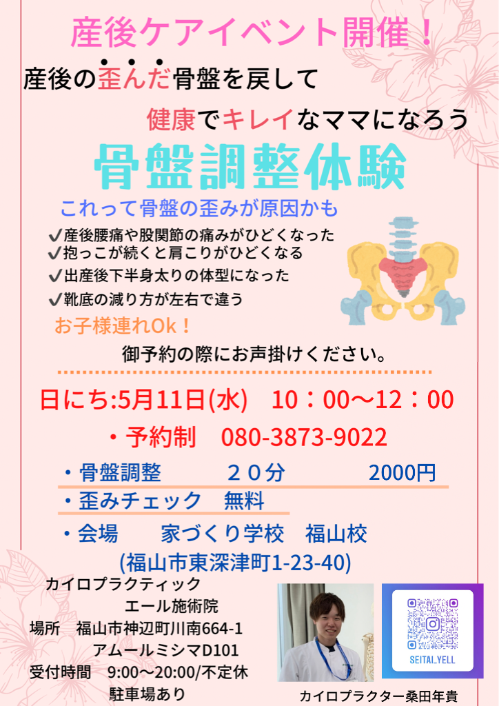 今日は、家づくり学校(福山校)さんで産後ケアの骨盤調整イベントをさせていただきました。